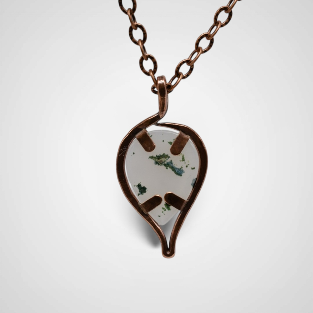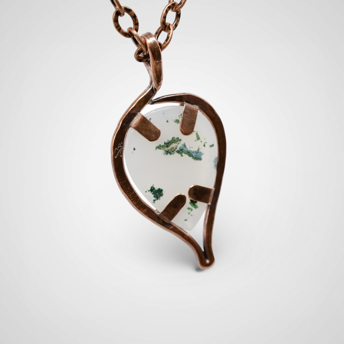 This Abstract Leaf with Floating Moss Agate Druzy Pendant is a quiet statement piece that feels both organic and a little unexpected. The teardrop shaped moss agate druzy appears to float within a tab setting that forms an abstract outline of a leaf, leaving space for light and movement to become part of the design.