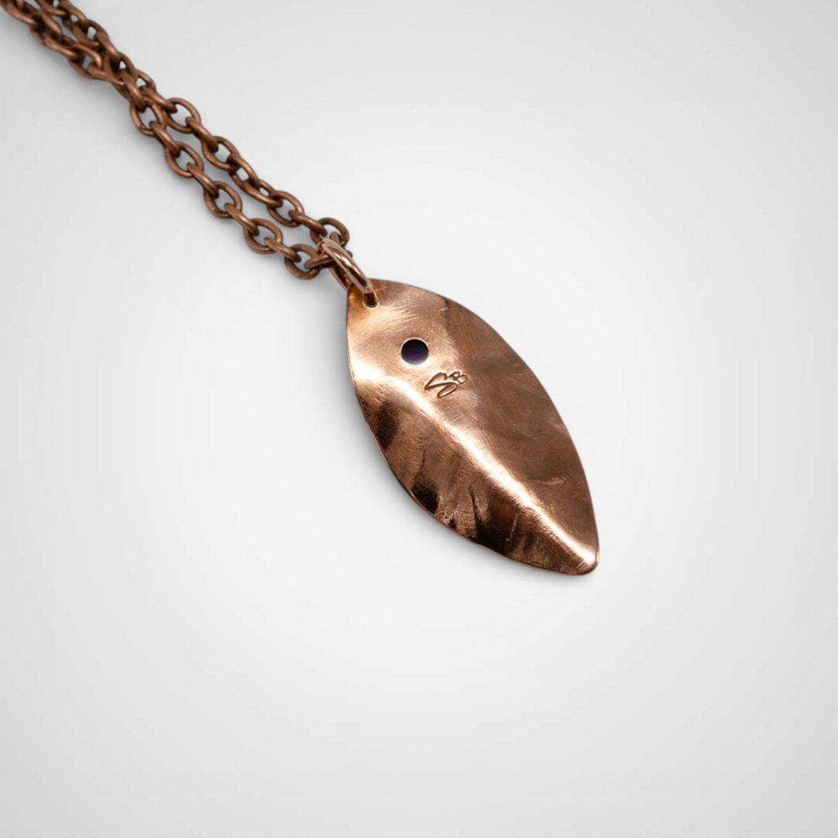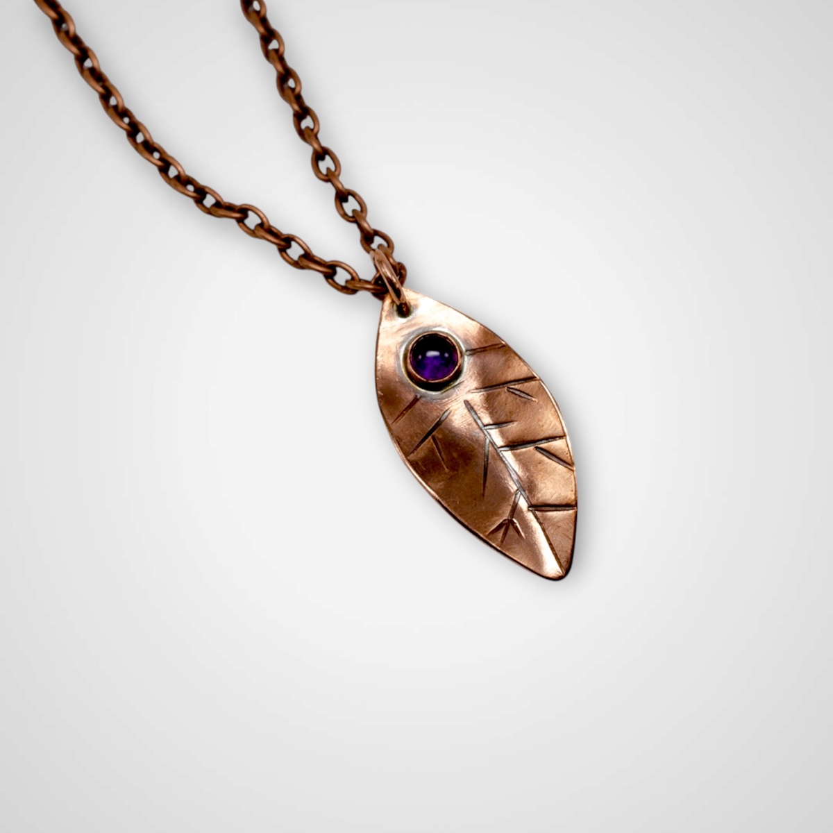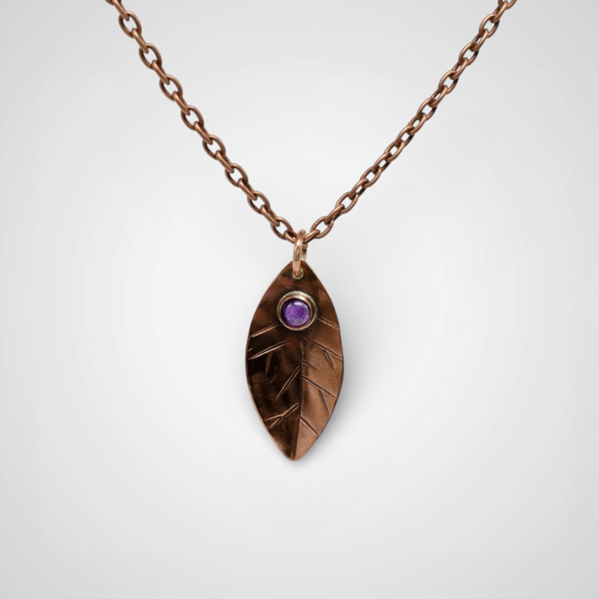Set near the top of the leaf is a 5mm round amethyst cabochon, adding a subtle pop of color and a gentle focal point. Amethyst is often associated with calm, clarity, and balance, and its rich purple tone brings a sense of quiet warmth to the copper.